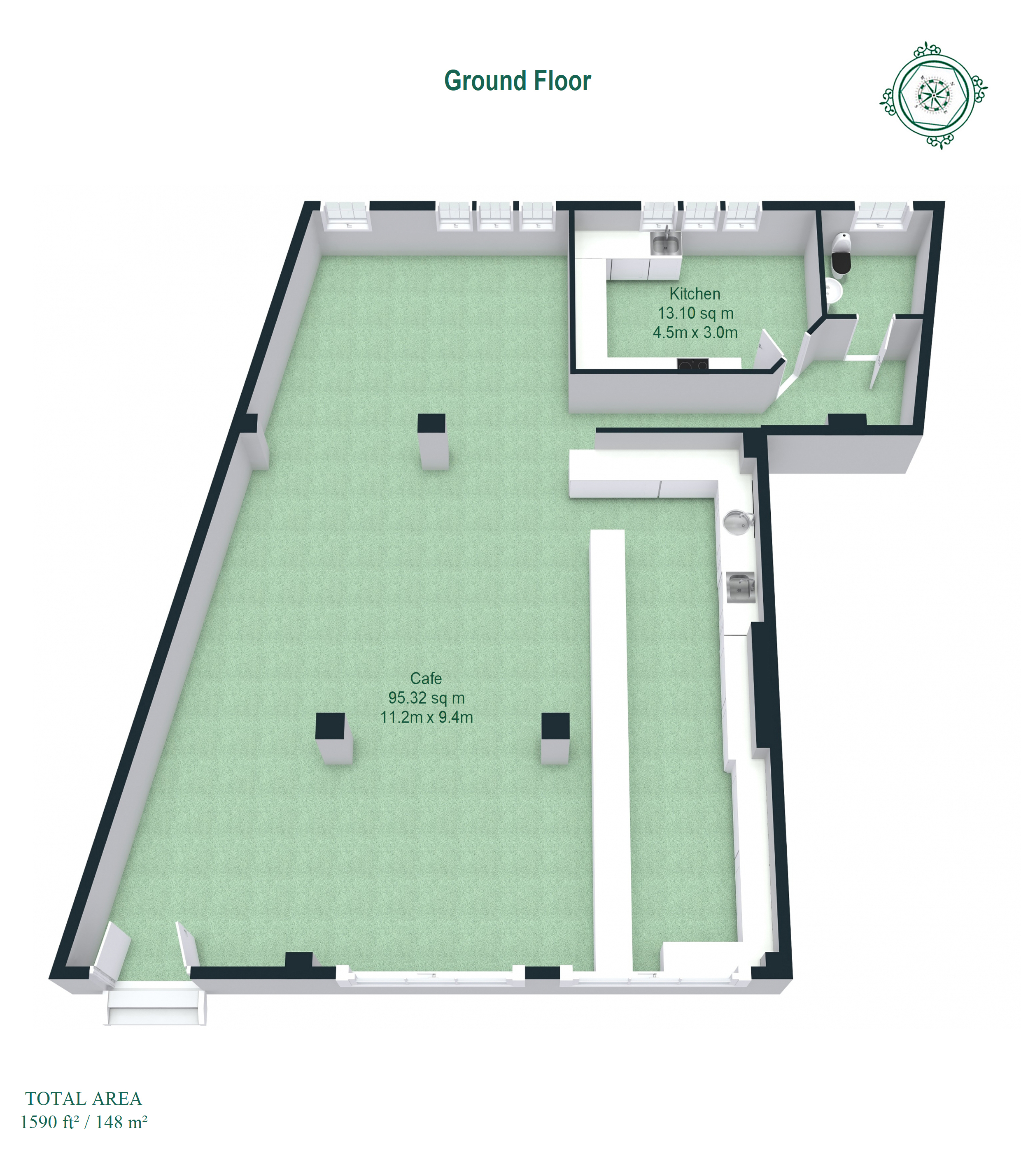 The unit holds a large kitchen with more than enough space for all the equipment that your business may need. That includes two fridges and a freezer. This commercial unit further benefits from additional storage. Everything you need to run a successful business is here!