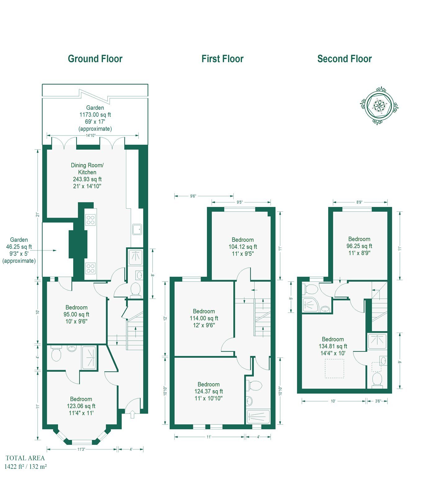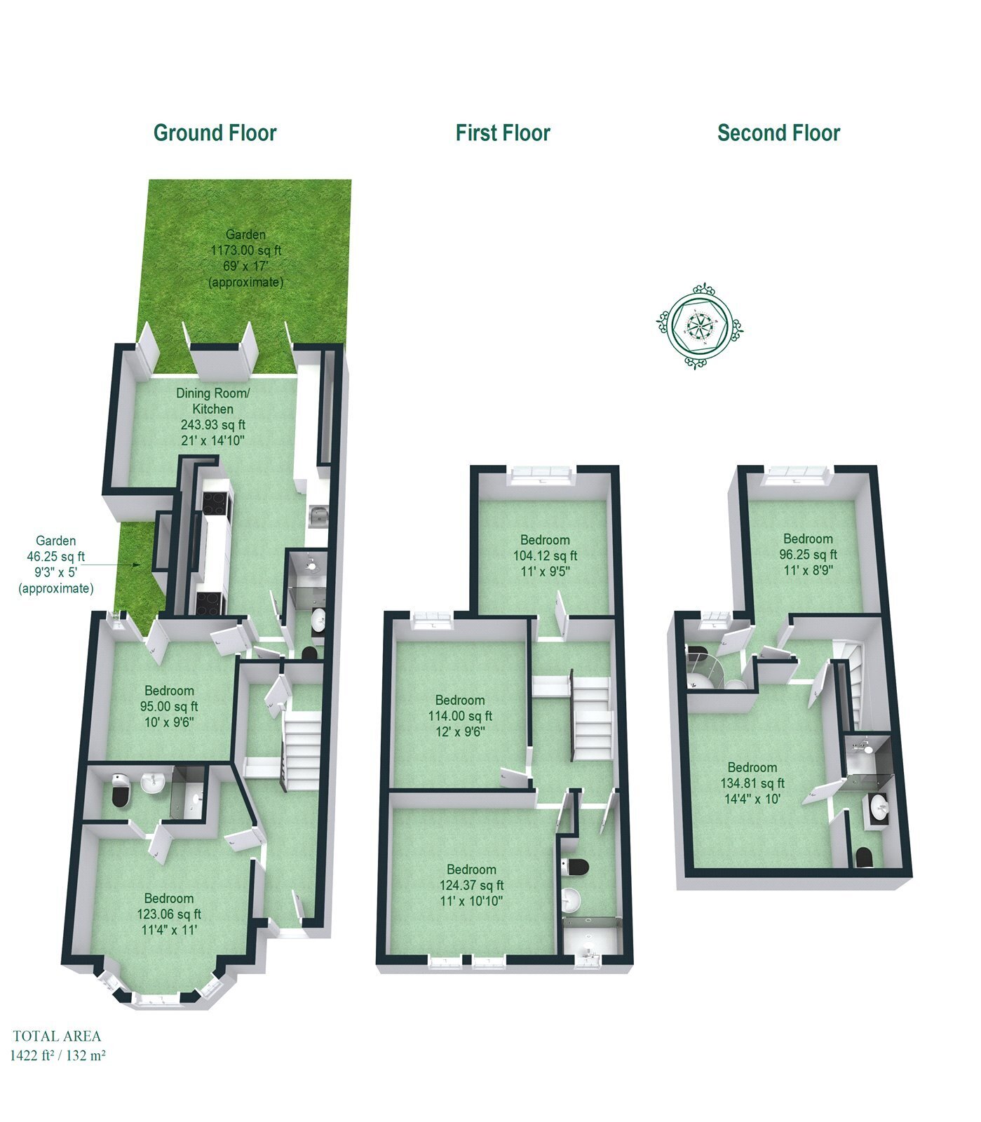 GROUND FLOOR: This floor includes two bathrooms and two generously sized bedrooms, one of which has an ensuite bathroom. This floor also houses the massive kitchen dining area, perfect for accommodating a group of people. The kitchen features two French doors leading out to the rear garden, which is spacious enough for outdoor activities such as BBQs or simply enjoying the sunshine during summer. This floor also includes two bathrooms and two generously sized bedrooms, one of which has an ensuite bathroom.