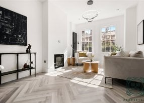 The property features two large reception spaces with stunning high ceilings. The front reception room has a grand square bay window that invites natural light throughout the day.
