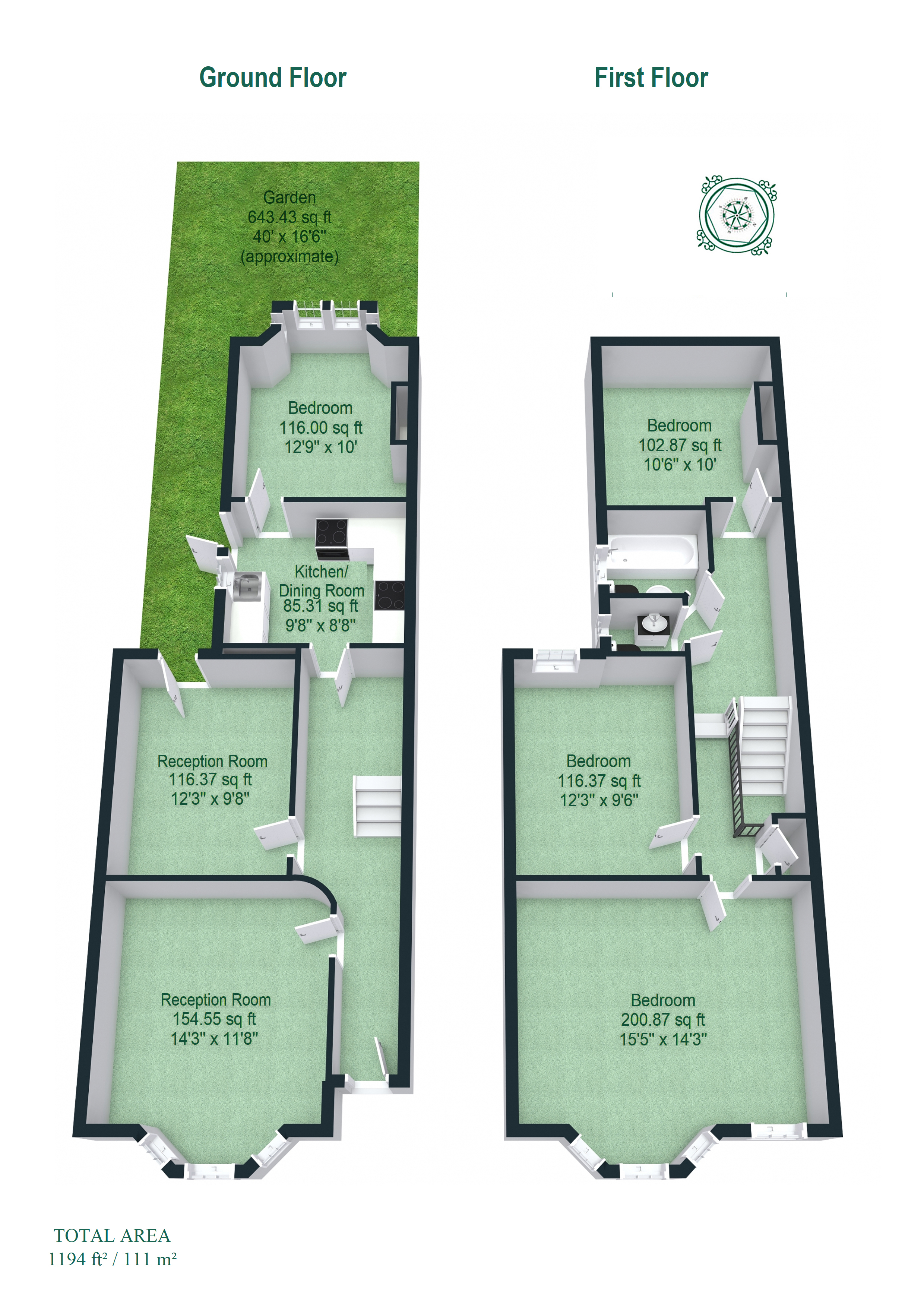 Upon entering, you are greeted by two large reception rooms, ideal for entertaining guests or hosting family gatherings. The kitchen/dining, which leads directly to the rear garden, is also located on the ground floor. Additionally, a rear bedroom with its own garden access completes this level.