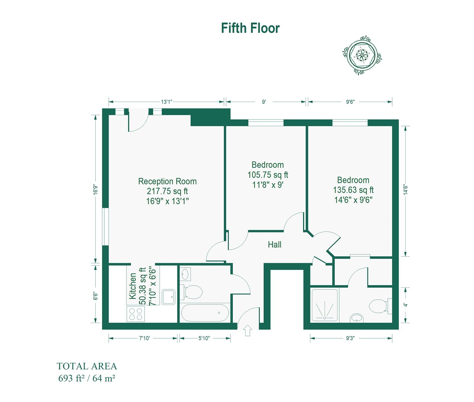 The apartment features a spacious reception room bathed in natural light, enhanced by floor-to-ceiling windows and direct access to a Juliet balcony with rooftop views – perfect for relaxing or entertaining. Adjacent is a well-fitted separate kitchen (50.38 sq ft), equipped with integrated appliances and smart storage solutions.