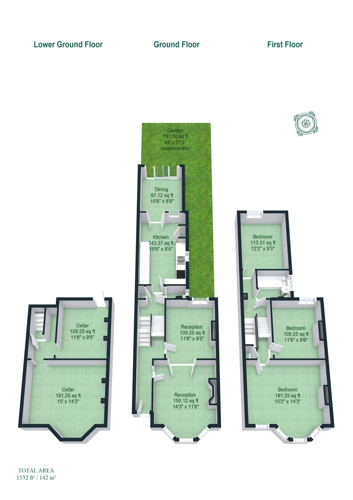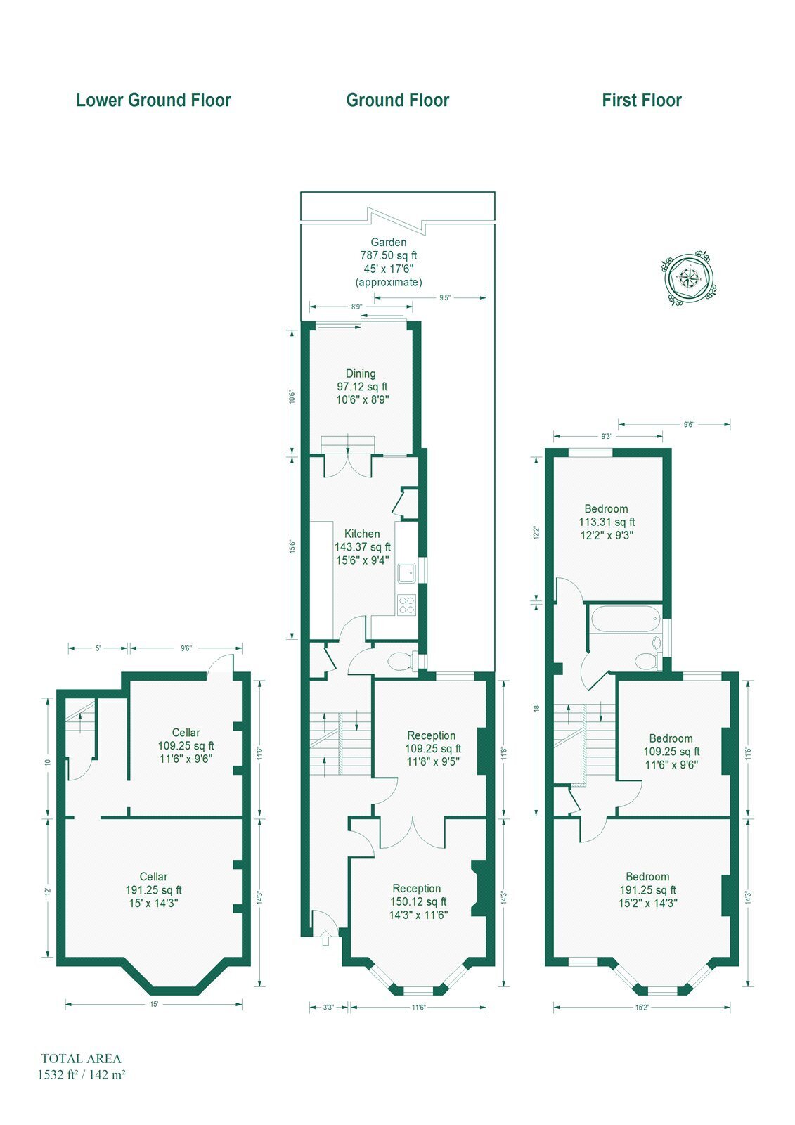 LOWER GROUND FLOOR - Towards the rear, the kitchen leads into a bright dining space with direct access to a generous private garden. This floor also boasts two cellar rooms with ample head height – ideal for conversion. This level holds massive potential for those looking to add value and enhance functionality.