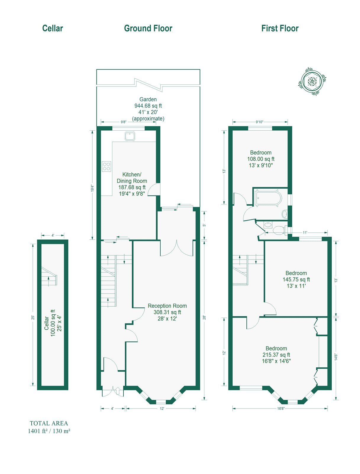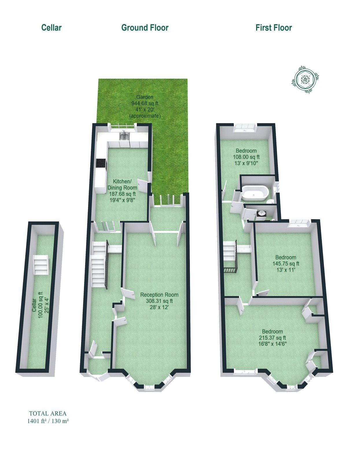Upstairs, the first floor comprises three well-sized bedrooms, including a characterful principal room with bay windows, a spacious second double, and a third bedroom overlooking the garden — all served by a centrally located family bathroom.