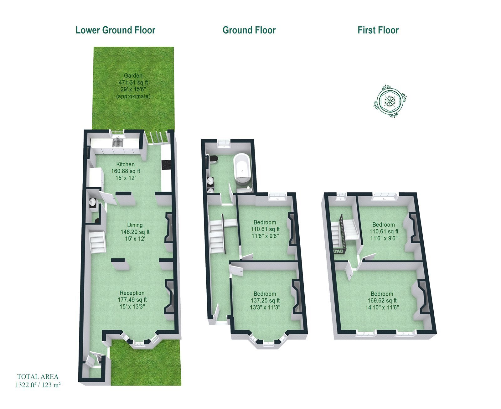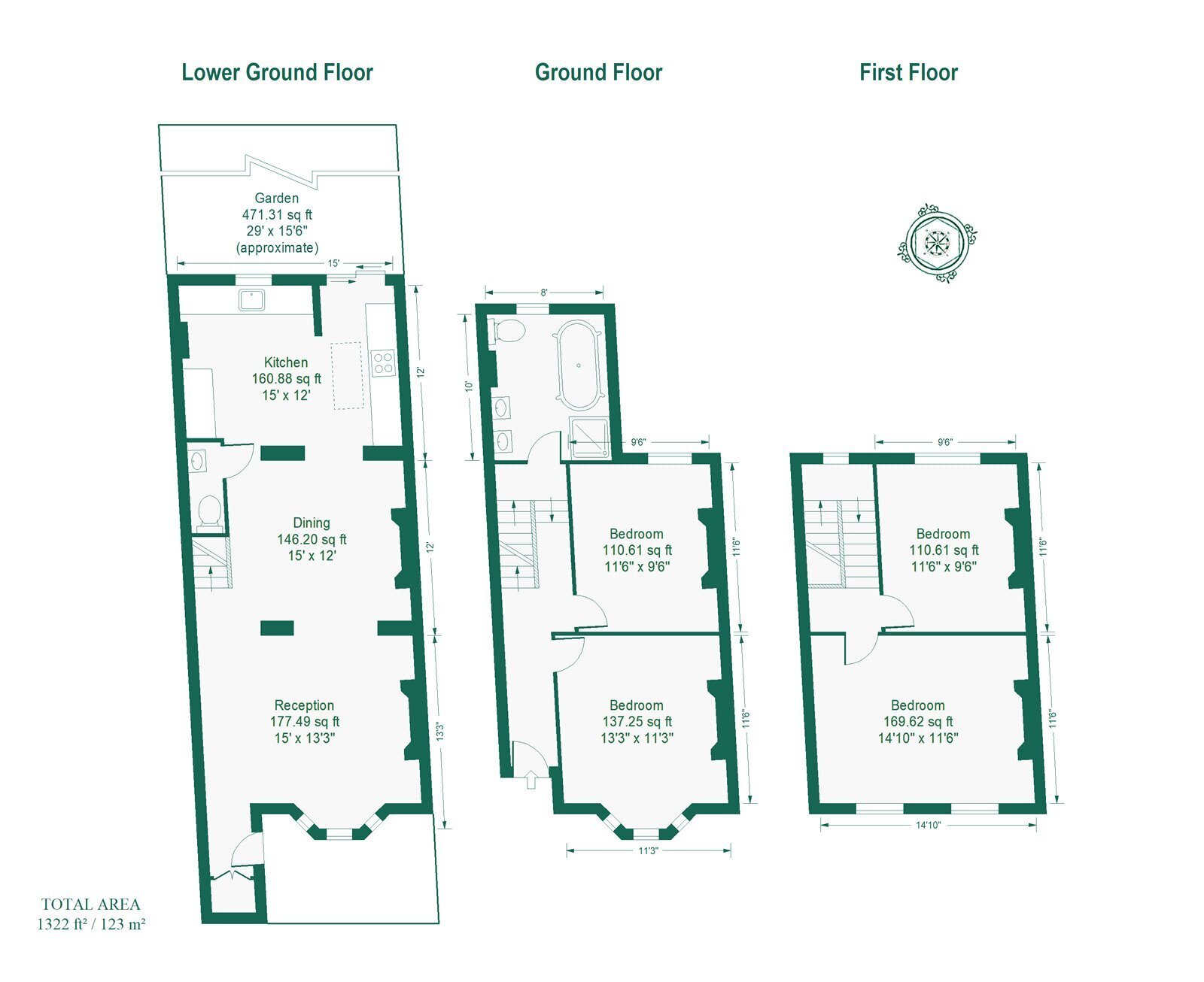 Upon entering the home at ground level, you’re welcomed by a classic Victorian hallway that leads directly into the main living areas. The front bedroom room, bathed in natural light from the bay window, features elegant proportions, ideal for both entertaining and relaxing. Just beyond, a second generously sized double bedroom sits quietly to the rear, overlooking the garden, and conveniently adjacent to a large, stylishly appointed family bathroom, positioned at the rear corner of the property.