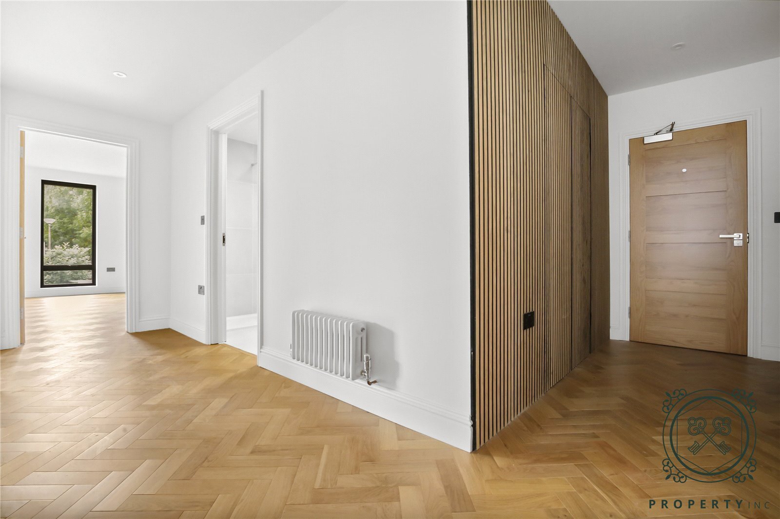 Designed with a meticulous eye for detail, this stunning home features real oak veneer panelling and elegant herringbone wood flooring throughout, creating a warm and sophisticated aesthetic. The impressive open-plan reception and kitchen area provides a seamless flow of space, leading directly onto a private balcony — perfect for entertaining or enjoying quiet moments outdoors.
