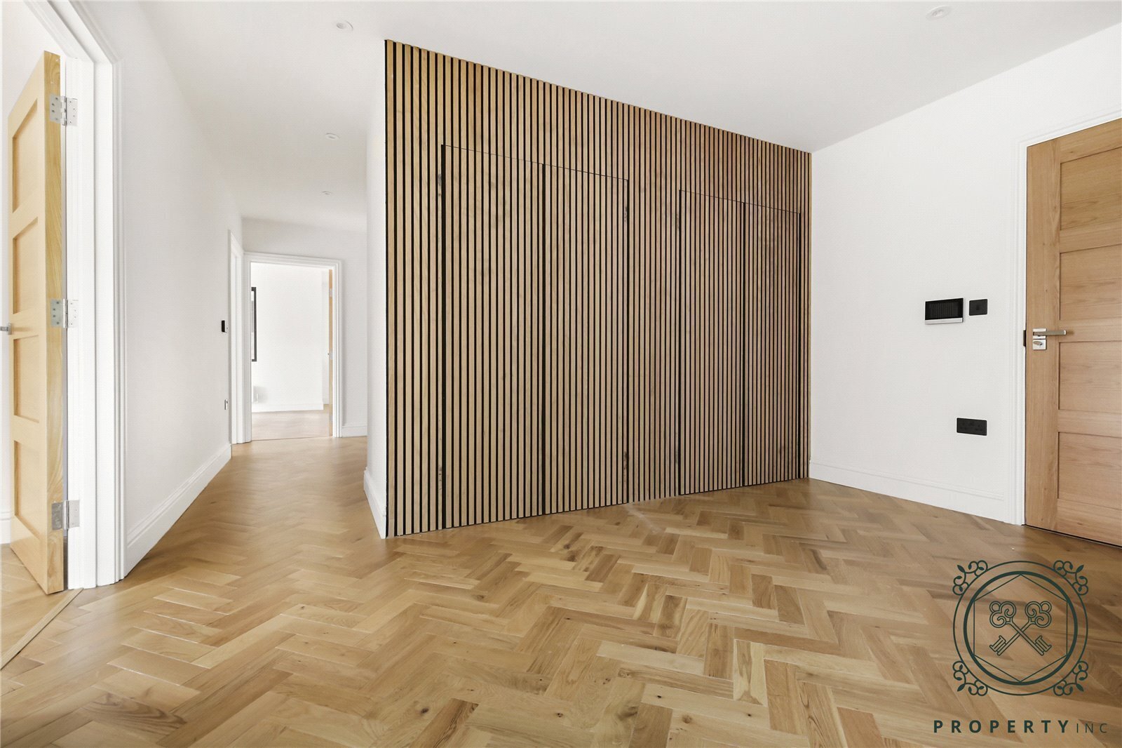 Both bedrooms enjoy direct access to the garden, filling the rooms with natural light and providing a harmonious indoor-outdoor connection. Throughout the apartment, real oak veneer panelling and herringbone wood flooring lend warmth and character, while the bathrooms are finished with chrome accents, elegant tiling, and refined detailing that exude understated sophistication.