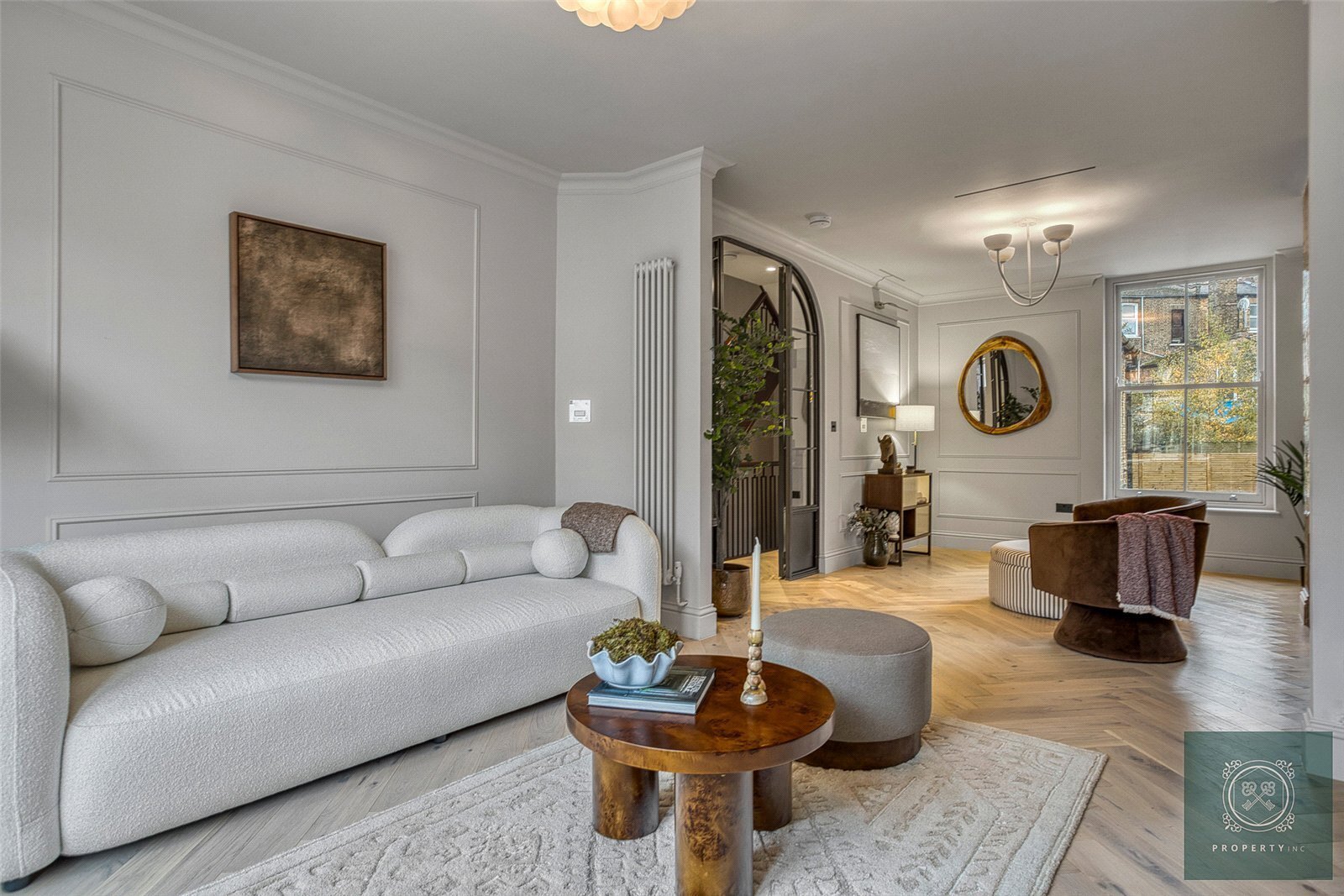 The ground floor retains the grandeur of the home’s Victorian origins, with an impressive hallway showcasing restored period panelling, high ceilings and ornate cornicing. To the front sits a bright and welcoming reception room with a large bay window framed by brand-new timber sash windows, flooding the space with natural light. The second reception room mirrors the same timeless aesthetic, offering a more intimate atmosphere ideal for reading, relaxing or entertaining. Adjacent to these rooms is a well-proportioned study/home office, providing a quiet and private area for work. Throughout this level, the craftsmanship is evident in the bespoke timber doors, bronze steel interior accents, and beautifully laid herringbone flooring.