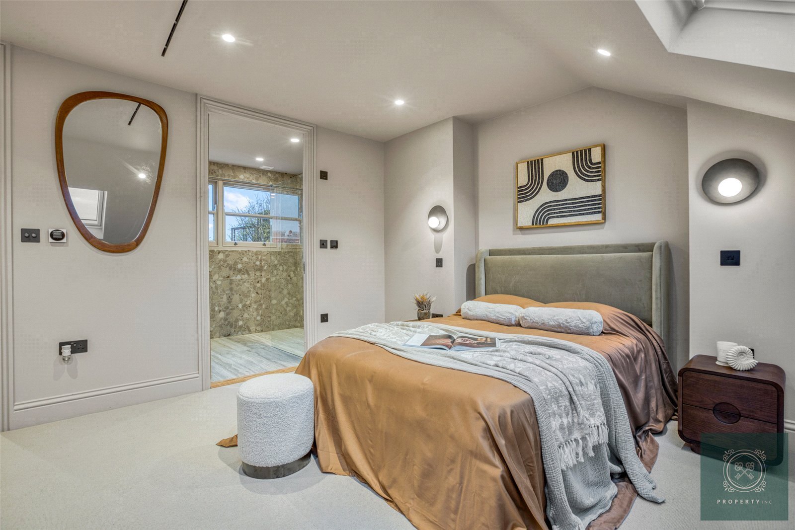 Occupying the top of the house is the second principal suite, offering privacy, elevated views, and exceptional comfort. The bedroom is generously sized, with bespoke fitted wardrobes lining the walls for ample storage. The en-suite bathroom echoes the high-quality specification found across the home, featuring stylish Mandarin Stone and Claybrook finishes, Aquaroc brassware, and electric underfloor heating. With ducted air conditioning and luxurious carpet, this floor offers a tranquil, hotel-like atmosphere—an ideal sanctuary at the top of the house.or heating. The landing area is wide and bright, connecting the rooms seamlessly while offering additional storage opportunities.