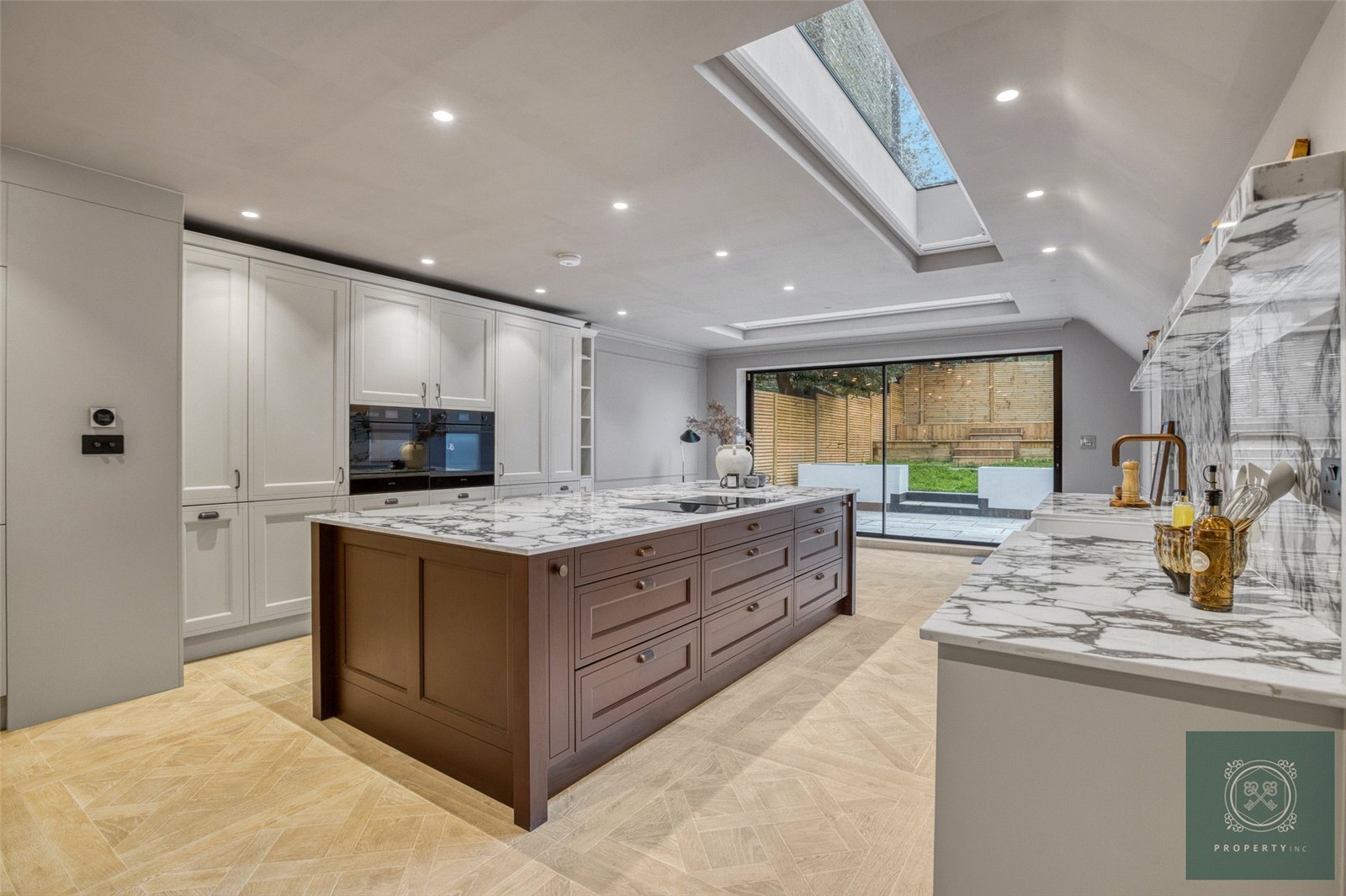The lower ground floor forms the heart of the home, designed as a dramatic open-plan kitchen, dining and living level that opens seamlessly onto the rear garden via full-height Cortizo sliding doors. This expansive space has been crafted with a bespoke handmade kitchen finished with Porcelain Viola worktops, Smeg appliances, a 4-in-1 hot water tap, and elegant timber cabinetry. The engineered wood herringbone flooring and discreet underfloor heating create a warm, welcoming feel throughout the level. At the front of the floor, a dedicated cinema room—fully wired with integrated speaker cabling—provides an intimate space for film evenings and family entertainment. A stylish guest WC and generous built-in storage complete this beautifully executed level. The lower ground also benefits from the Mistek fire suppression misting system, offering an additional layer of safety without compromising design.
