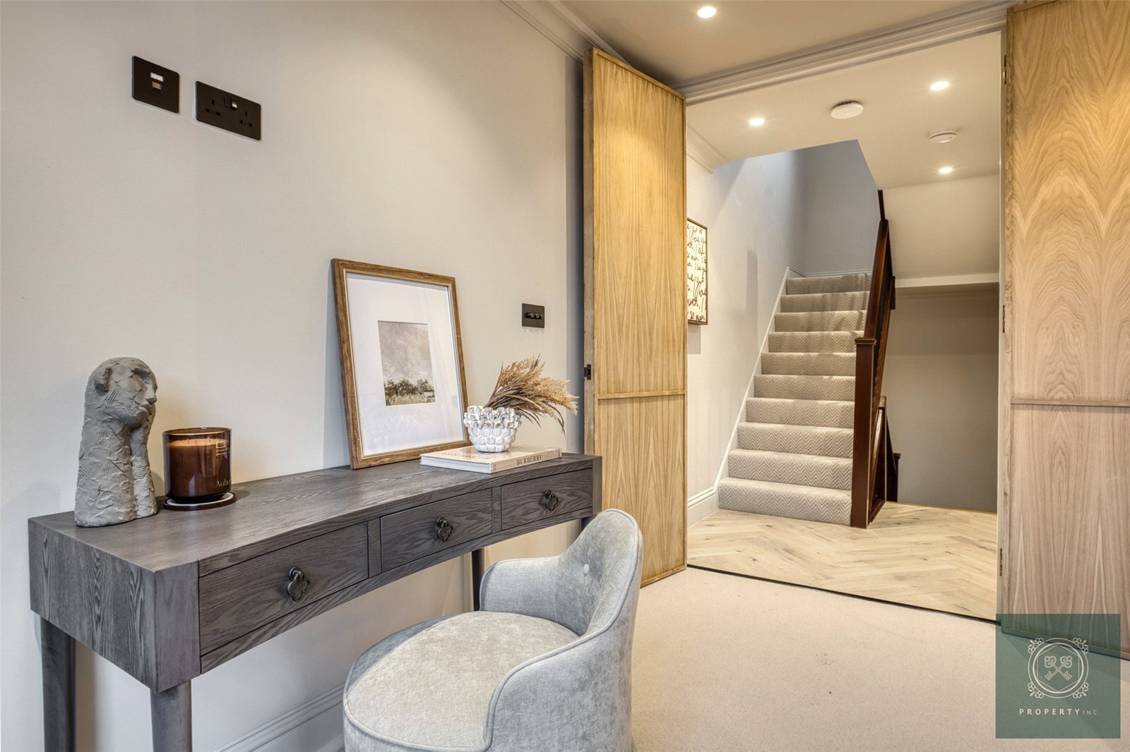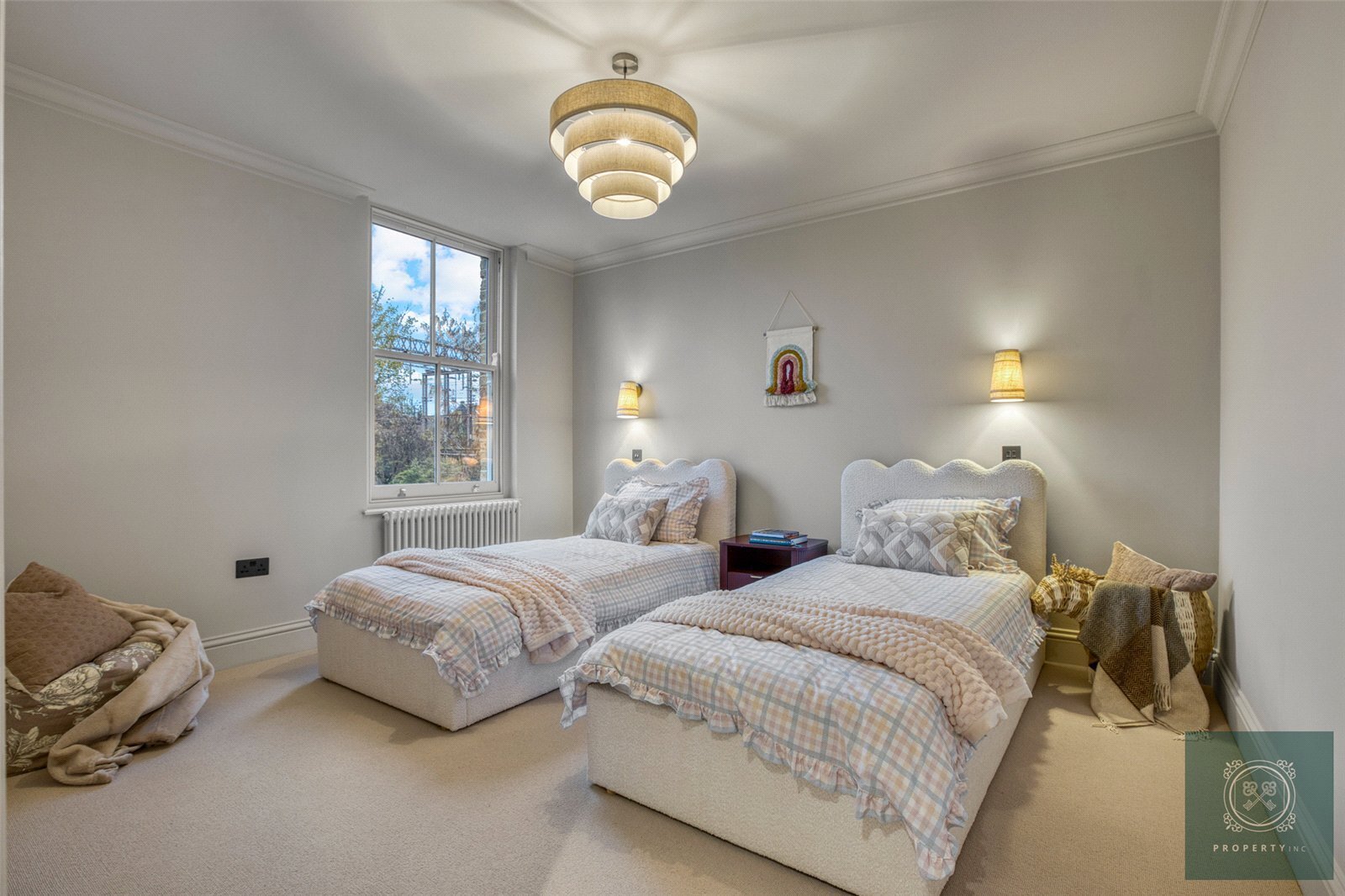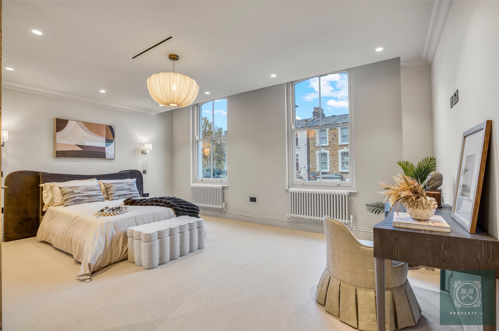 The entire first floor is dedicated to an elegant principal bedroom suite, offering a luxurious retreat with excellent proportions and exceptional natural light. The suite features a large double bedroom with bespoke wardrobes, a generous dressing room, and a beautifully appointed en-suite bathroom. Finished with Mandarin Stone and Claybrook tiles, Aquaroc fittings, and electric underfloor heating, the bathroom delivers a spa-like experience. Soft new carpeting underfoot and carefully selected COAT paint tones create a calm, sophisticated environment, making this primary suite a key highlight of the home.