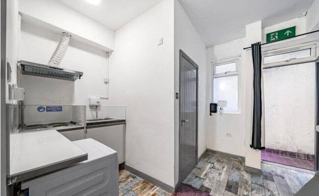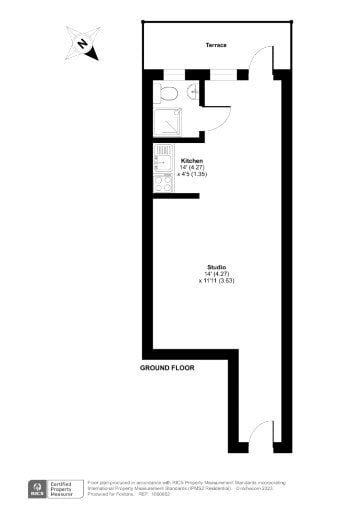 A separate beautifully designed kitchen sits neatly off the main living area, fitted with essential appliances and practical storage, while the adjoining shower room and thoughtfully laid out. One of the standout features of the property is the private terrace at the rear — a rare benefit for a studio, offering valuable outdoor space perfect for morning coffee, fresh air or potted plants.